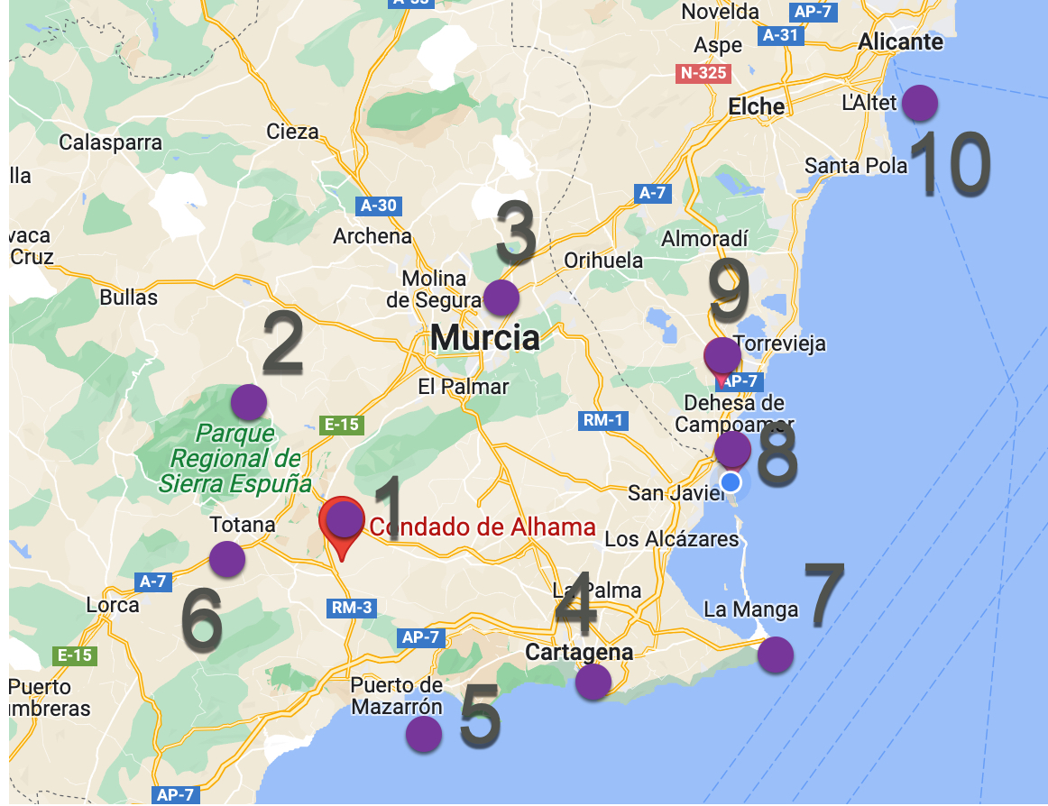 Afstanden vanaf Condado de Alhama: Regionaal park Sierra Espuña 28 km | Murcia-stad 49 km | Cartagena stad 48 km | Puerto de Mazarrón 30 km | Totana 17 km | La Manga 71km | La Zenia 77 km | Torrevieja 85 | Alicante luchthaven